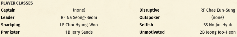 '팬 페이보릿'과 '리더' 클래스는 공존이 가능함을 알게 되었네요. 벤치코치의 리포트도 개선된 내용을 보여주네요. 마지막으로 디스트럽티브에 있는 채은성을 험블로 바꾸고, 프랭크스터의 조건을 만족시켜보겠습니다.