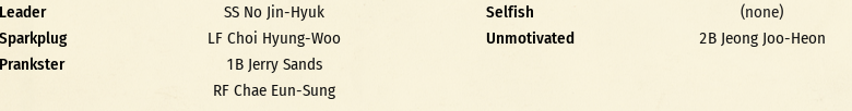 캡틴 없이 나성범 홀로 리더일 때에 비해, 벤치 코치의 리포트 내용이 개선되었음을 확인할 수 있습니다. 그러나 저 4명의 부정적인 영향을 제거하기에는 (캡틴, 정우람) 1명으로는 부족해보이네요.