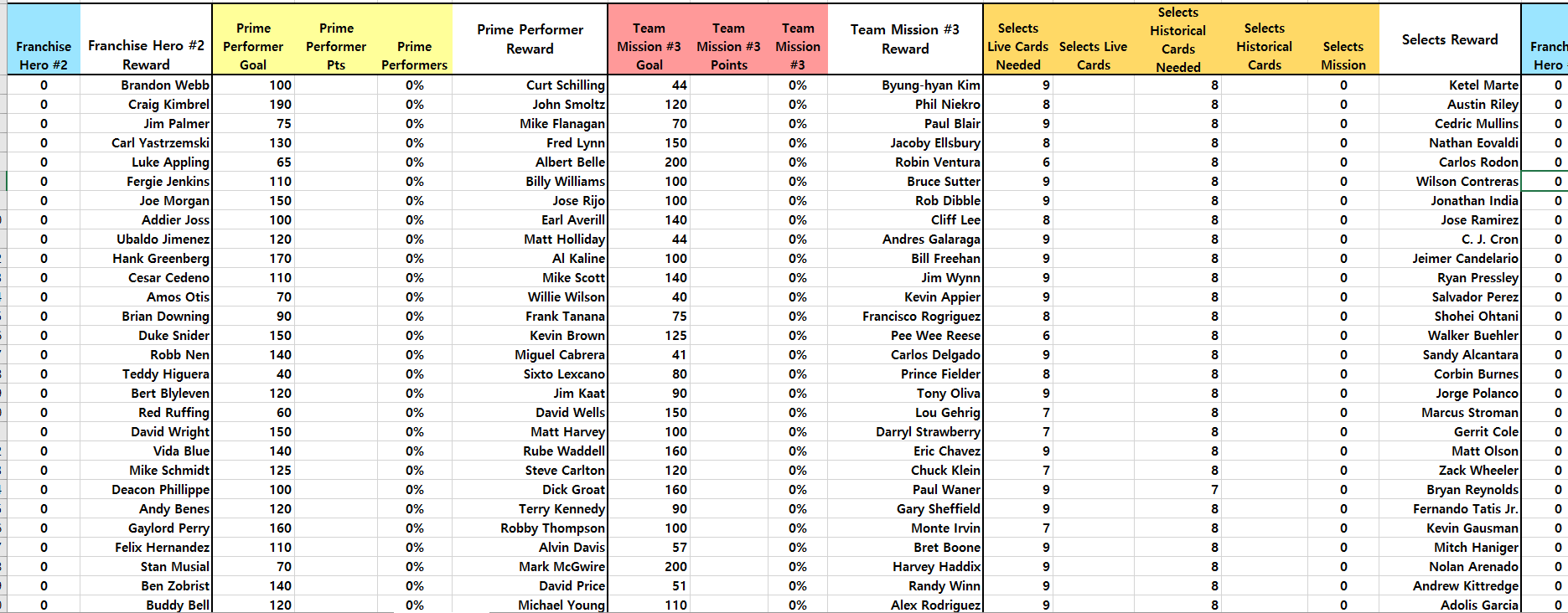 트래커 팀 3 시트입니다. 프랜차이즈 히어로 3을 위한 재료들을 정리해서 볼 수 있습니다.
