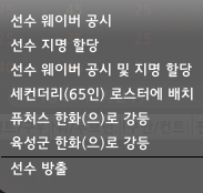 기본 직업은 한화 단장으로 세팅되어있으며, 지원가능한 직업으로는 LG, 두산, KIA가 있습니다. 세컨더리 로스터를 65인으로 두어, 정식 선수 명단을 구현했습니다. (웨이버 7일, DFA 10일, 장기 부상자 명단 30일)
