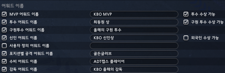 KBO리그의 수상명은 이와 같습니다. KBO MVP, KBO 신인상 등 실제와 동일한 이름을 사용했습니다.