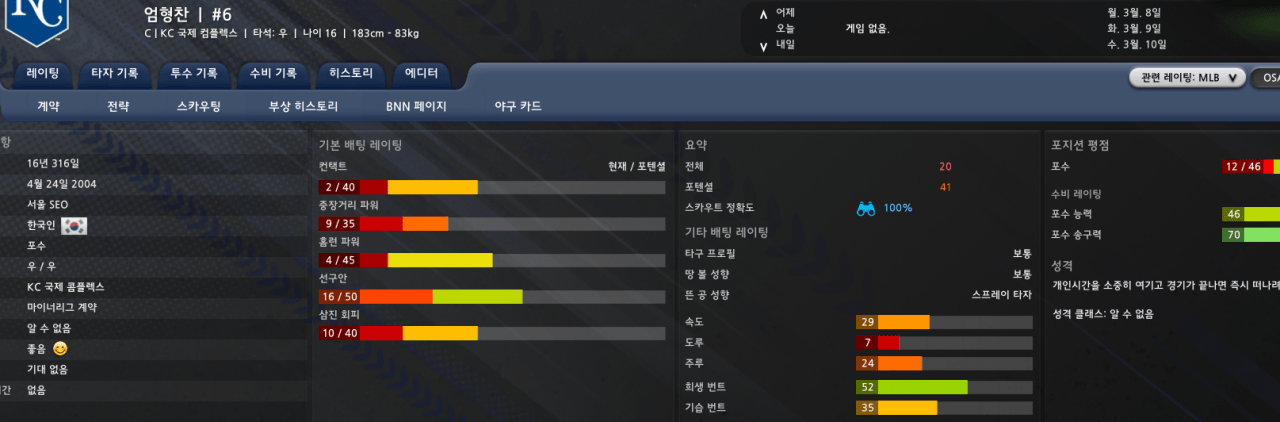다음버전 예정 : 심준석 PIT 이동, 대학 팀 8개로 축소, 고교 스케줄 재편 및 일부 선수(황준서, 손현기, 김휘건) 추가 등대학 개편안 : 북 = 고려 성균 연세 인하 | 남 = 단국 동아 영남 원광