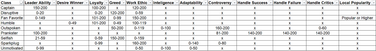 각 클래스를 만드는 팩터값들은 위와 같습니다. 다음 글에서는 이 표에대한 증명도 할 겸, 예시로 저번 글에 이어 가상 리그 PBL의 가상의 팀 '나눔 마켓'의 팀 케미스트리를 보여드리겠습니다.